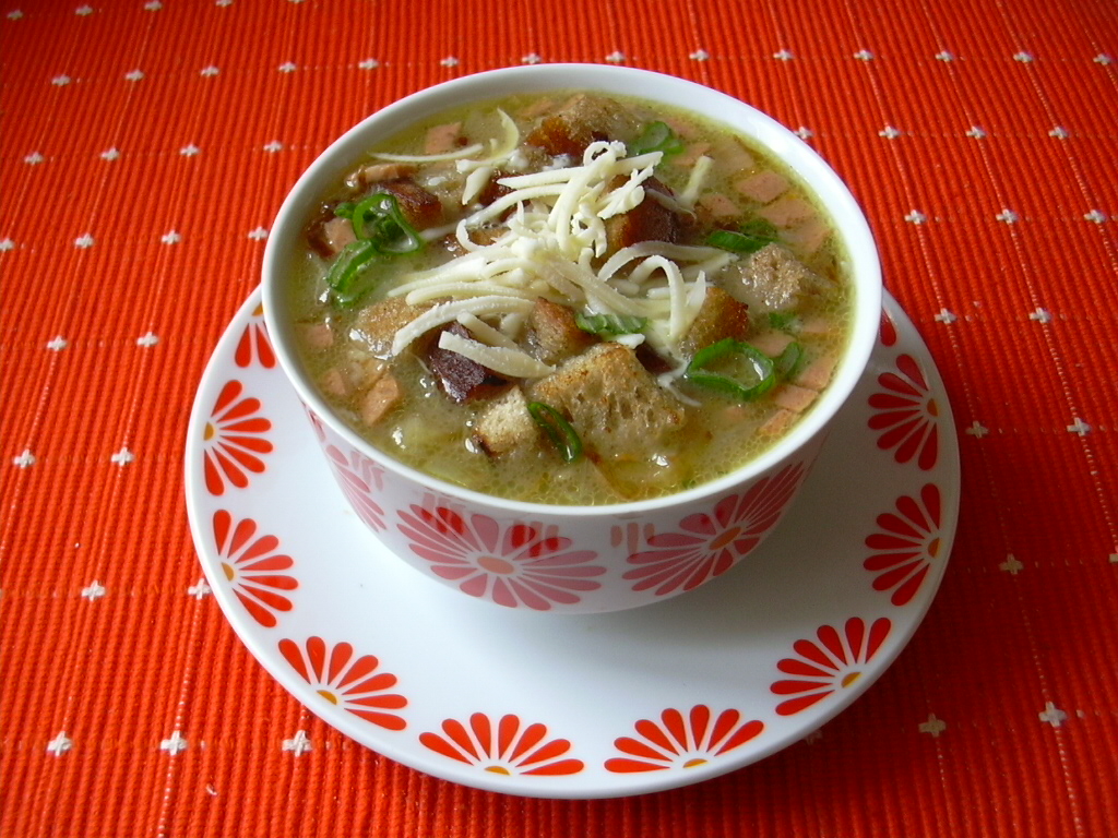 horkou polévkou a jako přílohu podáváme osmažené kostičky chleba.